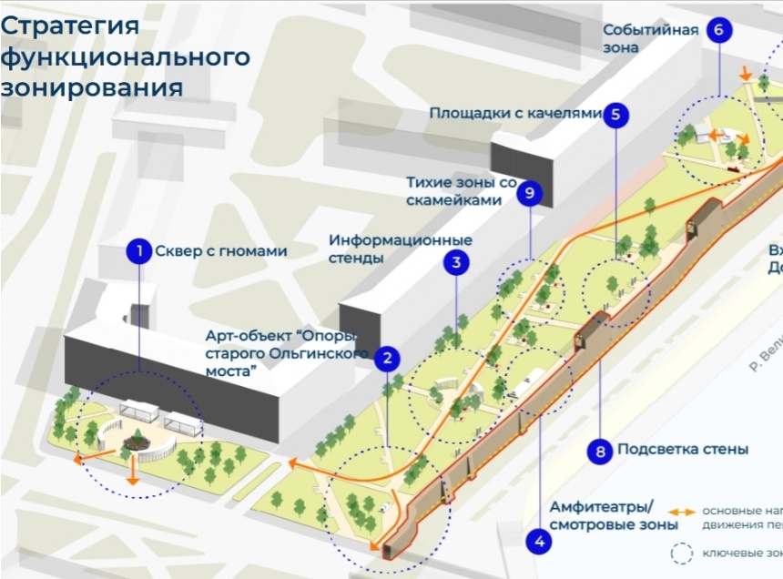 Специалисты предварительно наметили, где будут располагаться зоны отдыха, какие появятся малые архитектурные формы и тихие зоны, тротуары и прочие объекты.