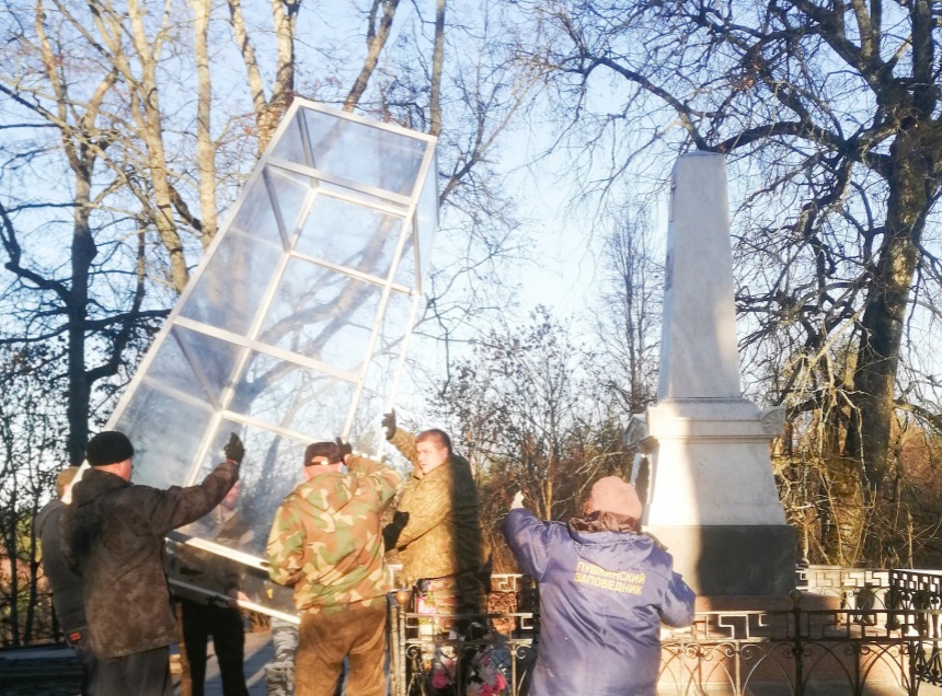Защитный футляр сняли с памятника на могиле А. С. Пушкина в Святогорском Свято-Успенском монастыре в Пушкинских Горах. Об этом «Псковской правде» сообщили в пресс-службе Государственного музея-заповедника «Михайловское».