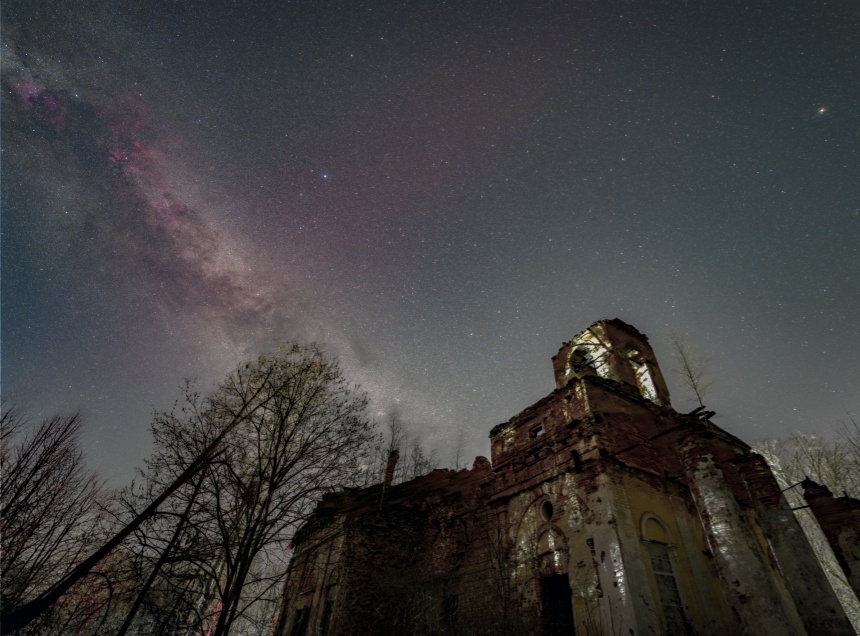 У старой полуразрушенной Воскресенской церкви круглый купол и верхней аркой, которая очень хорошо должна была смотреться на фоне звездного неба. «Однако, к сожалению, рядом горел яркий фонарь, тем не менее, при съемке изнутри он не сильно засвечивал кадр, и съемка имела смысл», – подчеркнул Пётр Митрофанов.
