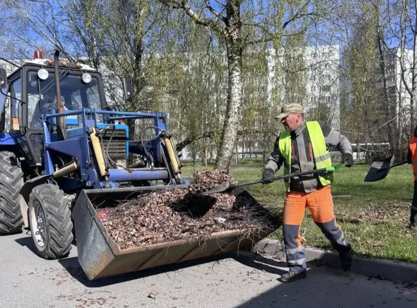 На этой неделе специалисты коммунальных служб продолжают в районе Запсковья работы по сезонному сгребанию растительности и прошлогодней листвы с зеленых зон.