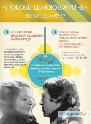 Поэтический вечер «Любовь, ценою в жизнь», посвященный любви Владимира Высоцкого и Марины Влади, пройдет в областной библиотеке. Как сообщила руководитель Регионального центра чтения Нина Яковлева, вечер состоится 12 февраля в 15.00
