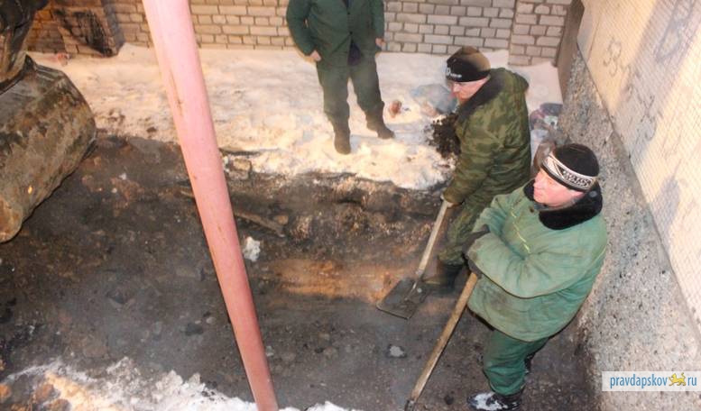 На месте прорыва трубы работает аварийная бригада «Псковских теплосетей». Предполагается, что авария будет устранена к 15 часам.