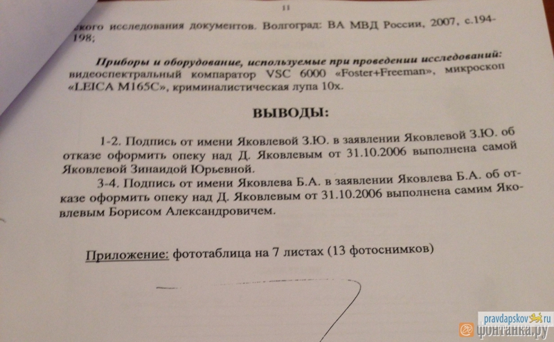 5 февраля была завершена почерковедческая экспертиза Главного управления криминалистики СКР. В результате были сделаны выводы: подписи Зинаиды Яковлевой (бабушка) и Бориса Яковлева (дедушка) на заявлении об отказе оформить опеку над Димой Яковлевым 31 октября 2006 года были выполнены ими самими. Для исследования применялось стандартное оборудование: видеоспектральный компаратор, микроскоп, криминалистическая лупа.