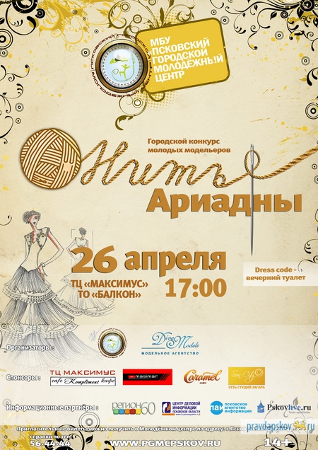 26 апреля в Пскове состоится финал традиционного конкурса молодых модельеров «Нить Ариадны». Мероприятие пройдет в ТО "Балкон" в ТЦ "Максимус". В 2013 году конкурс проводится уже в третий раз.