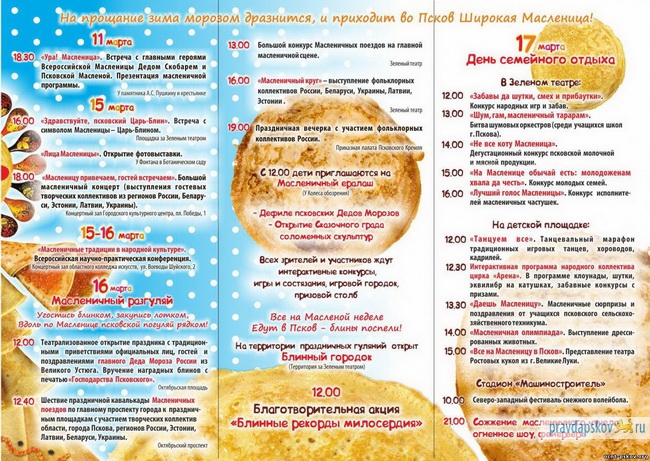 12.40 Шествие праздничной кавалькады Масленичных поездов по главному проспекту города к площадкам и главной сцене праздника –Зеленому театру с участием творческих коллектив области, города Пскова, регионов России, Эстонии, Латвии, Беларуси, Украины;