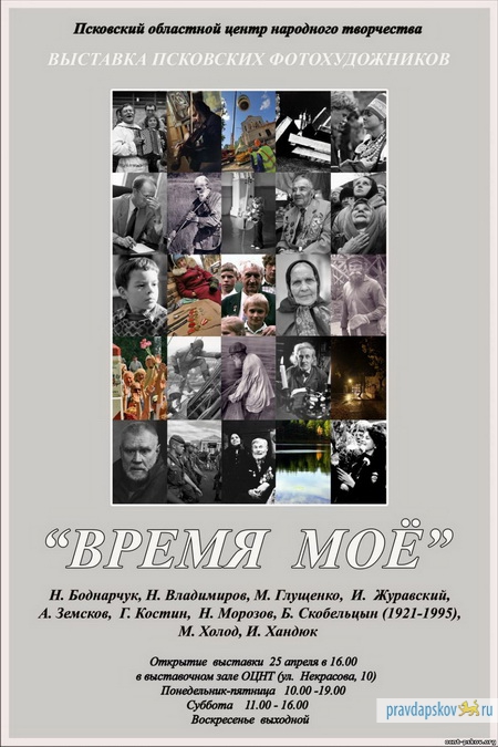 25 апреля в 16.00 в выставочном зале Псковского областного центра народного творчества (Псков, ул.Некрасова, 10) состоится открытие фотовыставки «Время моё».