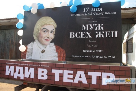 Бренд-мобиль Псковского академического театра драмы им.А.С.Пушкина будет регулярно ездить по городу в преддверии театральных постановок. Как сообщила заместитель художественного руководителя по административной работе Псковского академического театра драмы им. А.С. Пушкина Гертруда Авдюкова, 7 мая бренд-мобиль уже успел привлечь внимание псковичей к постановке "Муж всех жен", которая будет представлена в БКЗ филармонии.