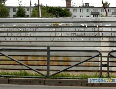 30-метровую растяжку "Здесь мог бы быть Макдоналдс…" на месте бывшего рынка на Четырёх углах в Пскове сменила новая надпись. Она гласит: «Комплексная застройка, конкурс проектов, широкое обсуждение!!! Нет – застройке без парковки!!!», передает ПАИ.