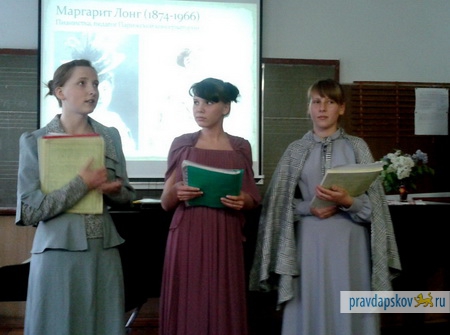 Как «Псковской правде» сообщили в колледже искусств, студенты и педагоги музыкального отделения предстали перед зрителями в образах известных музыкантов, поэтов, художников 19-20 веков: пианистки и педагога Маргариты Лонг (Анна Назарова), певицы Натальи Ермоленко-Южиной (Алина Чистякова), пианиста Рикардо Виньеса (Виктор Сергеевич Иванов), кутюрье Коко Шанель (Анна Мякушина), художницы Ирэн Мартин (Ирина Теляк) и др.