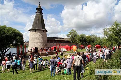 12:00 – Музыкально-театрализованное открытие детячьей слободы, города мастеров и развлекательных площадок, церемония поднятия символического паруса на площадке «Веселый остров», с розыгрышем бескозырок и бумажных головных уборов в виде кораблика и с пожеланием попутного ветра юному Пскову!