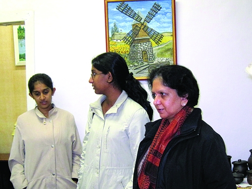 С ней вместе приехали две ее дочери. В среду она посетила Псково-Печерский монастырь. В четверг первая половина дня была отдана знакомству с традиционными русскими народными промыслами. После посещения Кузнечного двора и Выставочного зала областного центра народного творчества, где сейчас проходит выставка изделий мастеров Пскова и области, главный специалист центра Валентина Рогинская пригласила делегацию в уютное здание Дома ремесел. Индийские гости увидели старинный ткацкий станок, узнали особенности изготовления керамических изделий, обратили внимание на разнообразие текстильных изделий. Индийские гости расспросили об их работах резчика по дереву Владимира Иванова и мастера по керамике Галину Драчёву. Проявление интереса к русским народным ремеслам не случайно: в Индии ремесла тоже очень развиты, но так как мода и вкус часто меняются, существуют организации, которые занимаются обучением традиционным ремеслам, а также их продвижением и организацией центров продаж. Почти все, как у нас.