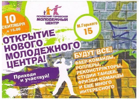 В Пскове сегодня, 10 сентября, в 15.00 часов открывается новый Молодежный Центр по адресу М. Горького, дом 15, сообщает пресс-служба Администрации города Пскова.