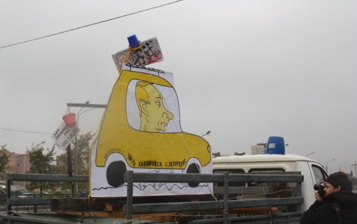 В 18:45 наконец привезли «Калину» - это был картонный муляж знаменитой «ласточки» Путина. В нарисованном окне красовался профиль премьера, а кузов был расписаннадписями с актуальными ценами на гречневую крупу. В 19:00 организаторы выдвинулись в сторону Смольного дворца.