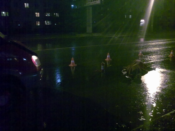 На место происшествия прибыл патруль ДПС УВД Пскова, место происшествия огорожено аварийными конусами. Водитель, совершивший наезд на пешехода, также находится на месте ДТП. Отметим, что около 20.30 одна из легковых машин чуть не наехала на лежащий на дороге труп мужчины, задев аварийный конус и протащив его по дороге.