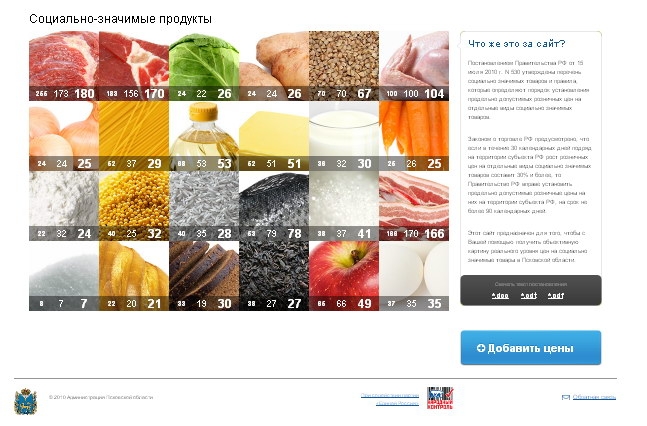 Сайт призван отслеживать цены на социально значимые продукты питания в динамике. На нем можно найти три цены на один и тот же продукт: от Росстата, от партийного проекта «Единой России» «Народный контроль» и от пользователей. То есть любой из нас может зарегистрироваться на сайте и оставлять свои наблюдения о ценах в конкретных магазинах.