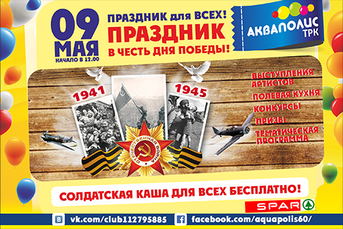 Псковичей и гостей города приглашают 9 мая в 12.00 на большой праздник в честь Дня Победы.У входа в гипермаркет «Spar» пройдет плац-концерт с участием детских коллективов и других артистов. Вокалисты исполнят тематические песни. Ведущий проведет тематические конкурсы и вручит отличившимся призы и подарки.