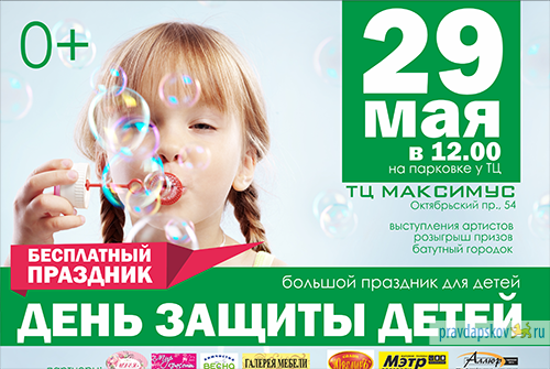 29 мая ТЦ «Максимус» устраивает большой бесплатный праздник в честь Дня защиты детей.С 12.00 для веселого семейного отдыха, на парковке у торгового центра будет развернут батутный городок, установлена сценическая конструкция и звуковое оборудование. В рамках развлекательной программы выступят детские коллективы и исполнители песен. Зрители смогут поучаствовать в конкурсах и выиграть призы.