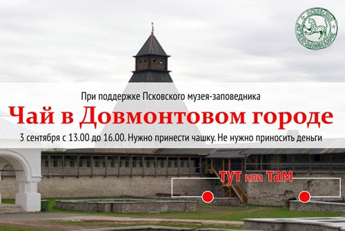 В субботу, 3 сентября с 13:00 до 16:00 на территории Довмонтова города в Псковском кремле состоится чаепитие. Чашку горячего напитка гости праздника получат абсолютно бесплатно. Важное условие – с собой нужно принести собственную чашку. Можно приносить выпечку для себя и товарищей по чаепитию.