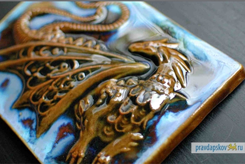 Простые мотивы и невероятные переливы глазури - яркая особенность керамических изразцов Юрия Пересады. Животные, сказочные персонажи, мифические существа способны украсить не только камин или печку, но и стать милыми талисманами дома - в каждом изразце проделаны специальные отверстия для веревочки, чтобы изразец можно было повесить на стену.