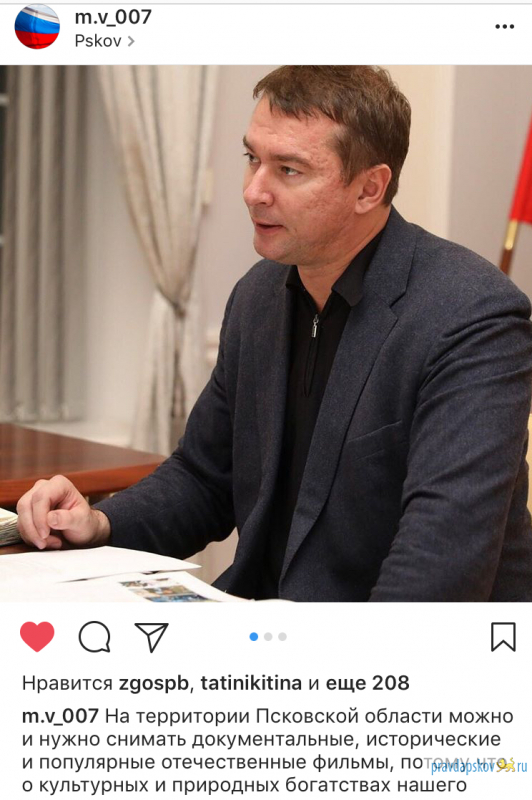 «На территории Псковской области можно и нужно снимать документальные, исторические и популярные отечественные фильмы, потому что о культурных и природных богатствах нашего региона должны знать все! – написал в своем Инстаграм-аккаунте врио губернатора Михаил Ведерников.