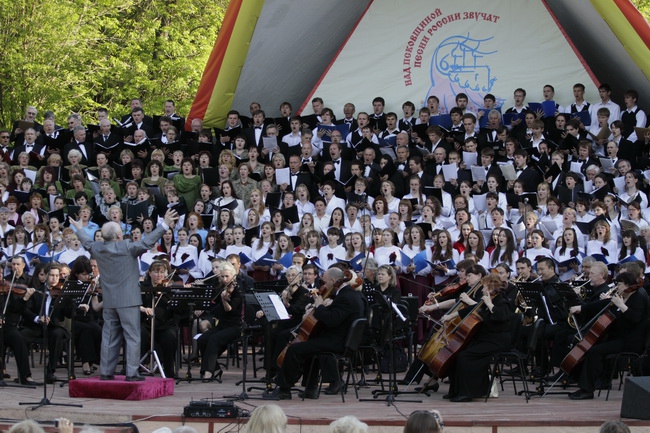 В Зеленом театре 22 мая юбилейный гала-концерт начался с «Гимна России» в исполнении сводного детского хора Пскова и Великих Лук. Причем «Гимн России» был особенный: музыка Свиридова, слова Твардовского. Написан в начале 60-х годов прошлого века как альтернатива гимну Александрова-Михалкова. Так что в каком-то смысле Псков свою исторически независимую позицию все же обозначил. В гимне Свиридова-Твардовского поется: «Да будет песнь побед народных, / Как слава Родины в веках, / Жива на всех твоих свободных, / Больших и малых языках». Накануне на открытии фотовыставки в областной библиотеке примерно о том же, только прозой, говорил композитор Николай Мишуков – человек, который возродил Певческий праздник в Пскове. По его мнению, общая песня и есть национальная идея. И он же вспомнил те времена, когда в Пскове из 180 тысяч жителей 30 тысяч пело в хорах. Это было документальное подтверждение того, что Псковский край – песенный. Сейчас все выглядит значительно скромнее, но на итоговых концертах почти не сказывается. 1300 человек со всего Северо-Запада России спели дружно. В сопровождении симфонического оркестра Псковской областной филармонии прозвучал еще один гимн – гимн Пскова (музыка Мишукова, слова Золотцева).