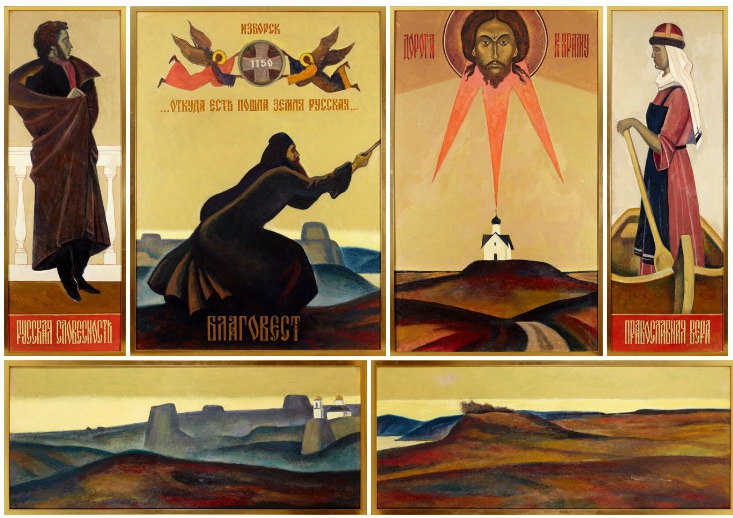 На стенах палаты будут изображены облики двух великих людей русской истории и культуры, жизнь и деятельность которых связана с псковской землёй и в частности с Изборском: великого поэта Александра Пушкина, основателя Русской Словесности, поэзия которого пронизана идеями православия, обретшего на псковской земле глубокий национальный характер и Святой равноапостольной княгини Ольги, принесшей на эту историческую землю Православную Веру и основы русской государственности. Между ними расположится полотно «Видение и явь Княгини Ольги», образно трактующее летописное придание о трех лучах в небе, увиденных Ольгой над Довмонтовой кручей. На двух параллельных стенах предлагаются композиции на тему «Благовеста над изборской землёй», изображающей монаха-звонаря символически исполняющего этот колокольный звон и полиптих «Симфония закатов», посвящённый колориту псковской иконописи и трактующий версию о цветовом реализме древних псковских иконописцев. Так же предполагается разместить живописную композицию «Дорога к храму», повествующую о возвращении Православной Веры на нашу землю, а при входе в палату предполагается экспонировать полотно «Набат», сюжет которого является ярким спутником нашей истории, за годы ушедших эпох не раз призывавший наш народ к защите и сопротивлению силам захватчиков и суровой природы.