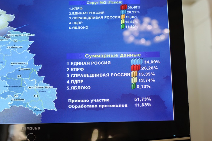 На мониторе в пресс-центре выборов в Псковской области выведены очередные предварительные данные голосования. Обработано 12% протоколов УИКов.