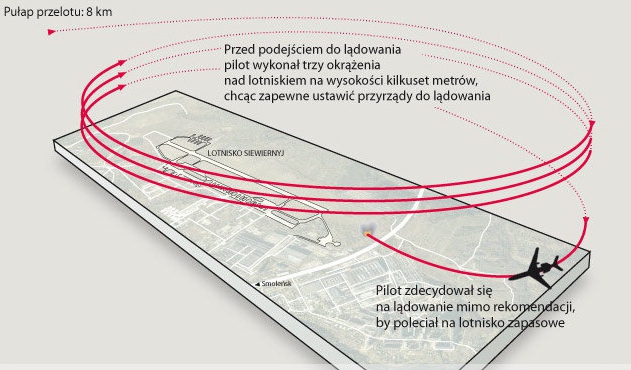 В соответствии с положениями авиации пилот сам себе начальник, и у него нет необходимости консультироваться с кем-либо - даже если плата будет главой государства, пишет польская Gazeta Wyborcza. Было ли так в данном случае, неизвестно. На борту были начальник Генерального штаба армии и начальник Военно-Воздушных Сил. Президентский самолет кружил вокруг аэропорта три раза, но эксперты считают, что в этом нет ничего необычного. Пилот, таким образом, знакомился с топографией, и назначал правильный курс.