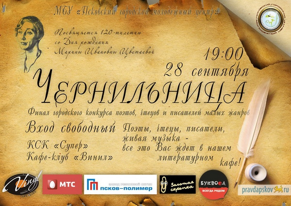 В Пскове во второй раз пройдет конкурс молодых поэтов, чтецов и писателей малого жанра. Финал мероприятия состоится 29-го сентября 2012 г. в клубе «Винил» (Октябрьский 56). Начало в 19.00, вход бесплатный.