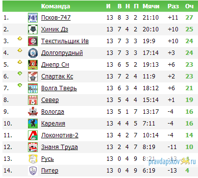 Таким образом, в активе псковской команды после 13 матчей 27 очков. Кроме того, мы имеем лучший показатель по забитым мячам – 21 гол.