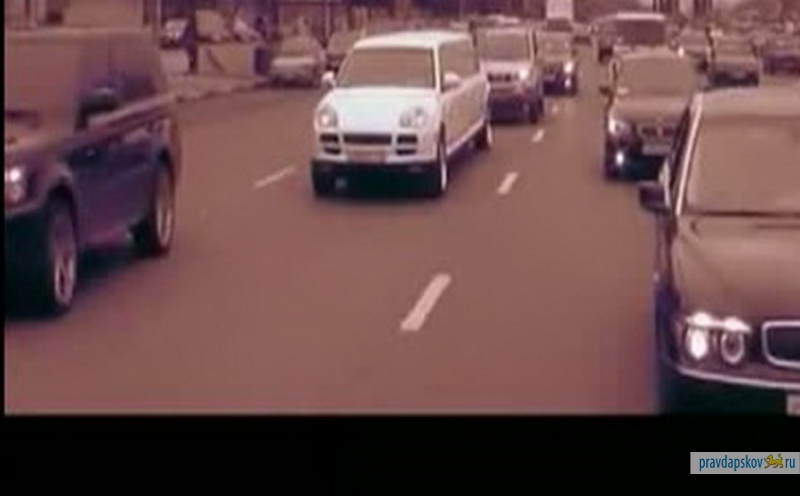 Как сообщает корреспондент "Псковской правды", кортеж, состоящий из одного автомобиля типа "лимузин" белого цвета и пяти крупногабаритных автомобилей стоимостью не менее 1,5 миллионов рублей каждый (BMW, Infinity, Land Rover и прочих марок 2008-2011 г.в.) с госномерами регионов "60" и "53" передвигается по центральным улицам Пскова с включенными сигналами аварийной остановки.