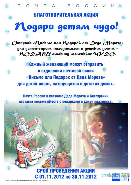 УФПС Псковской области – филиал ФГУП «Почта России» предлагает всем желающим принять участие в благотворительной акции «Подари детям чудо».