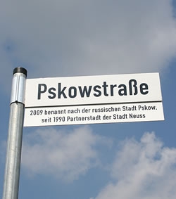 Как сообщает официальный сайт Нойса-на-Рейне, в развивающемся районе породненного с Псковом города, рядом с интернациональной школой 31 мая официально открыли Псковштрассе. На дорожном указателе значится: «Названа так в 2009 году в честь русского города Псков – партнера Нойса с 1990 года».