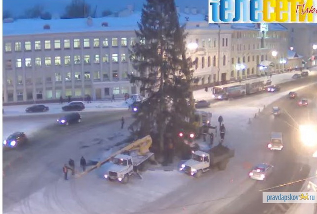 Завершаются работы по установке новогодней ели в центре Пскова. Как передает корреспондент «Псковской правды», ствол дерева уже установлен в специальный колодец. В настоящий момент рабочие выравнивают клинья.