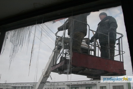 Как передает корреспондент «Псковской правды», на борьбу с циклопической сосулькой была брошена бригада из трех человек. Общими усилиями лед удалось сбросить вниз. Теперь автомобилям и пешеходам не грозит смерть от обрушения глыбы.