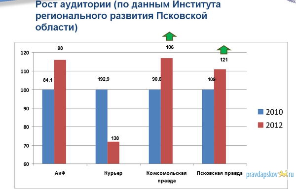 Несмотря на общий спад тиражей на рынке печатных СМИ, у аудитории «ПП» и «КП» за год произошел солидный скачок, отмечают исследователи. В частности, на 12 тысяч человек (с 109 тысяч до 121,389 тысяч человек) возросла аудитория газеты «Псковская правда». При этом у конкурента издания – газеты «Курьер» аудитория значительно уменьшилась – сразу на 54,5 тысяч человек, отмечается в данных исследования.