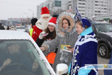 В преддверии новогодних праздников сотрудники ОГИБДД УМВД России по городу Пскову и учащиеся многопрофильного правового лицея № 8 вышли на пешеходные переходы областного центра. Старшеклассники, одетые в костюмы новогодних персонажей, поздравляли водителей и пешеходов с наступающими праздниками и желали всем участникам дорожного движения быть внимательными и серьезно относиться к своей безопасности.
