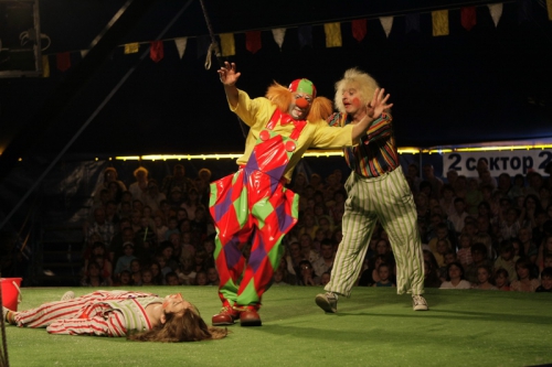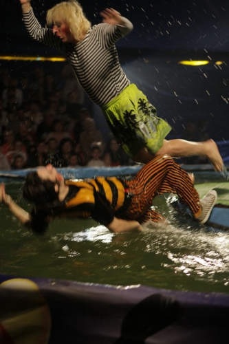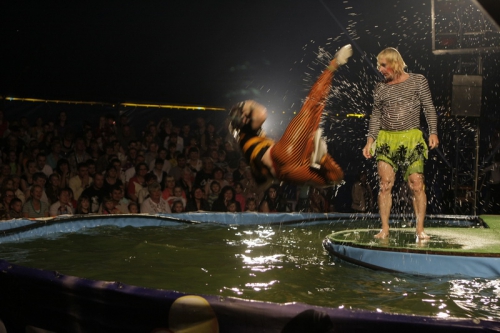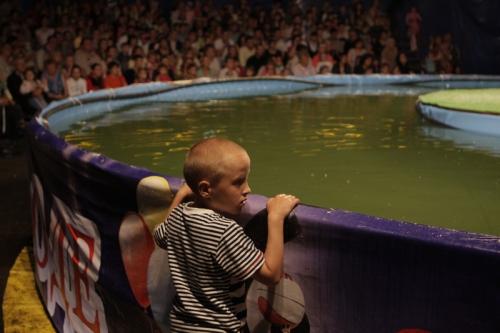 Ну, какой цирк, даже водный, без клоунов? Веселые ребята в гриме и ярких костюмах забавляли публику, устраивали интерактивные конкурсы, кидались в публику надувными мячами, пускали огромные мыльные пузыри и радостно плескались в бассейне.