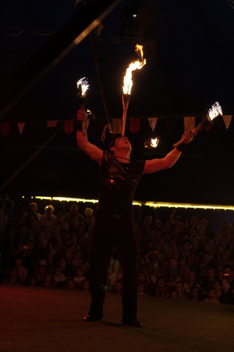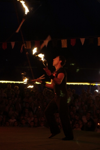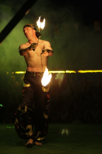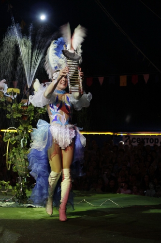 Наиболее теплый прием у публики получили пиротехники. Что и говорить, огонь и вода на редкость удачное сочетание, а когда с жаркой стихией ловко обращается красивый парень- удовольствие вдвойне приятное. Зажигательные ребята крутили огромные огненные обручи, жонглировали факелами и катались на горящих велосипедах.