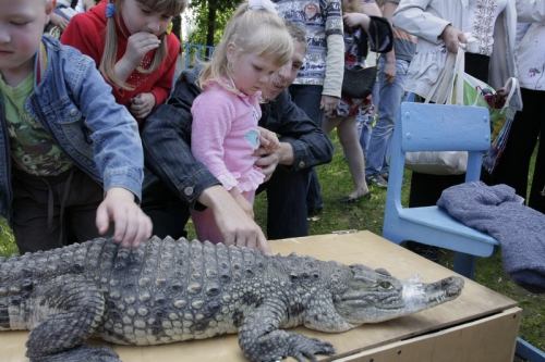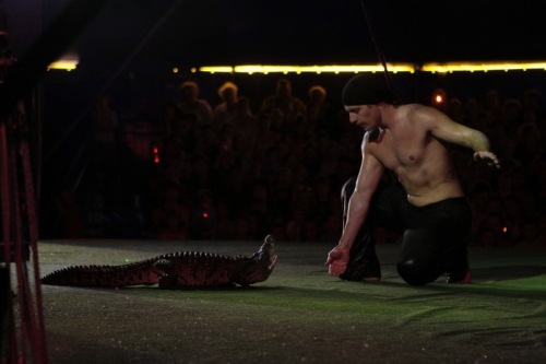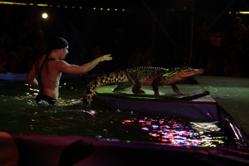 Главный гвоздь программы - 120-килограммовый крокодил, имеющий оригинальную прописку в водах Нила. Бесстрашный дрессировщик отважно сражался с 3-х метровой рептилией на воде, после чего решил позволить зрителям насладиться видом красавца вблизи и...выпустил его в зал. Восторгу и визгам не было предела.