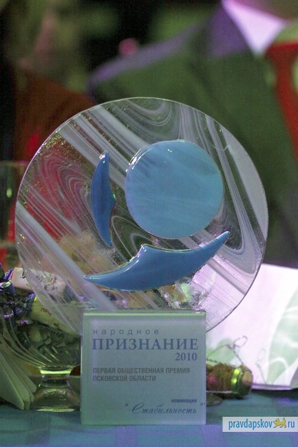 Во вторник, 21 декабря, в Пскове в гигант-холле "Пароход" прошла церемония вручения Первой общественной премии Псковской области "Народное признание". Награды от учредителей премии - Псковского агентства информации, телекомпании "Телеком" и Управления информационной политики и связям с общественностью Псковской области были вручены в 12 номинациях. Также было вручено несколько специальных наград.
