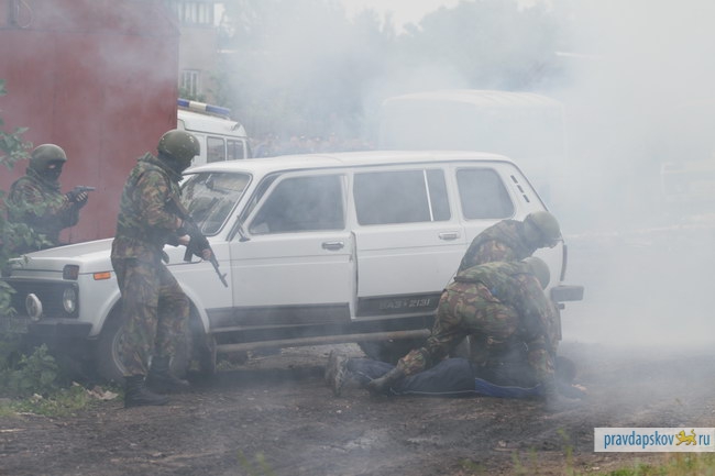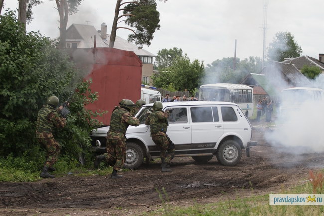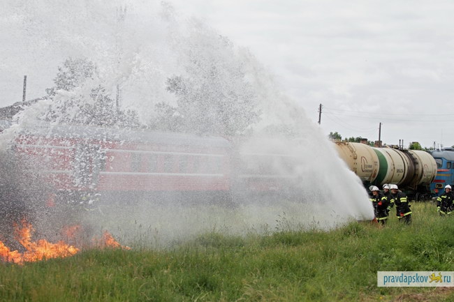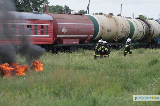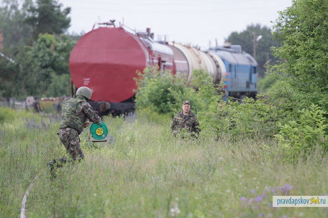 22 июня на железной дороге в Черёхе под Псковом прошли тактико-специальные учения по пресечению теракта на транспортном объекте, в ходе которых были задержаны условные террориты и предотвращен розлив и дальнейшее возгорание нефти из железнодорожных цистерн.