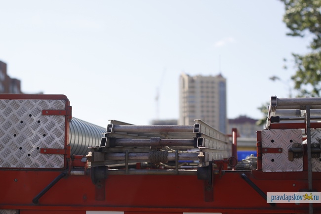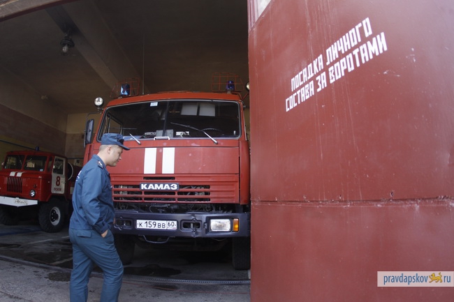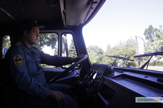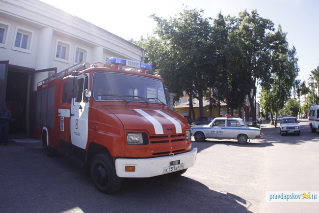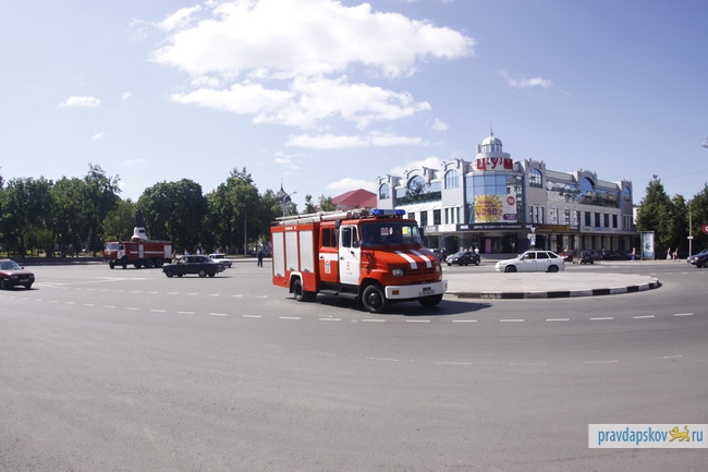 Пожарные машины с включенными проблесковыми маячками и сиренами преодолели несколько перекрестков в городе, тогда как сотрудники ГИБДД УВД Пскова следили за поведением водителей и пешеходов.