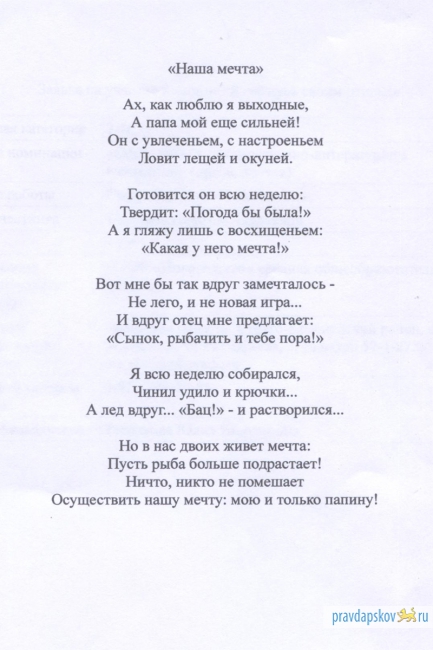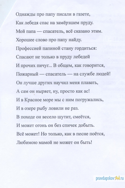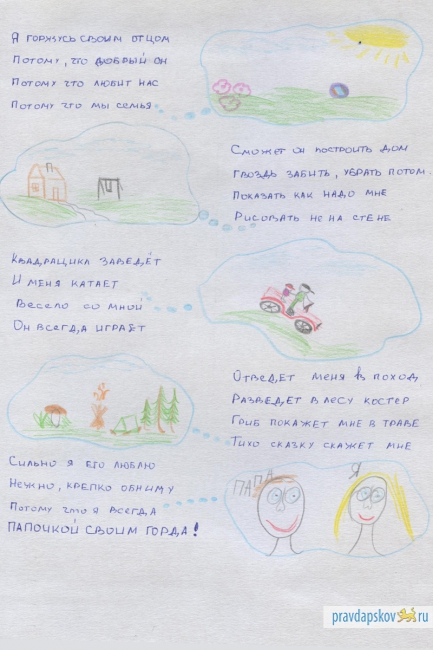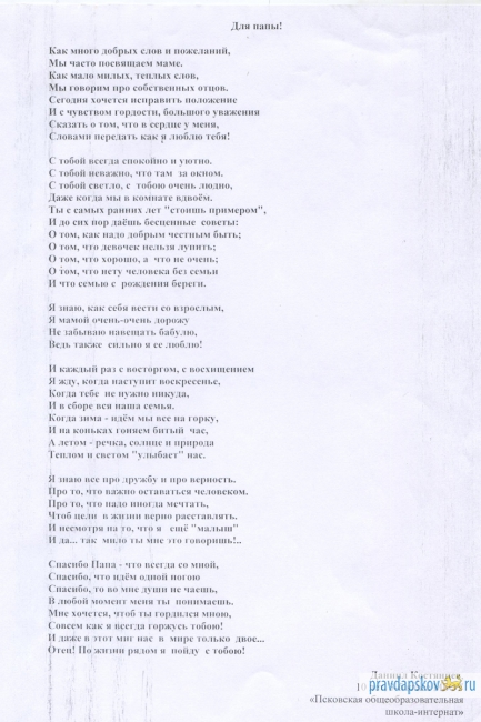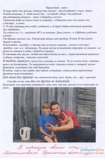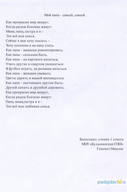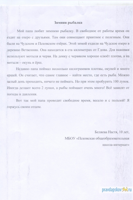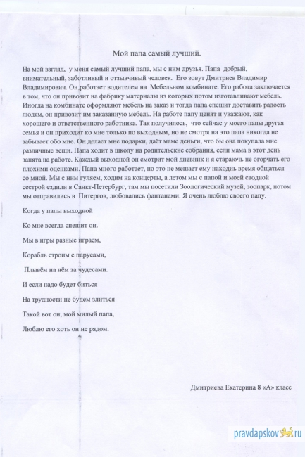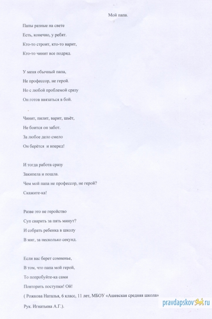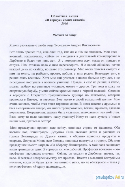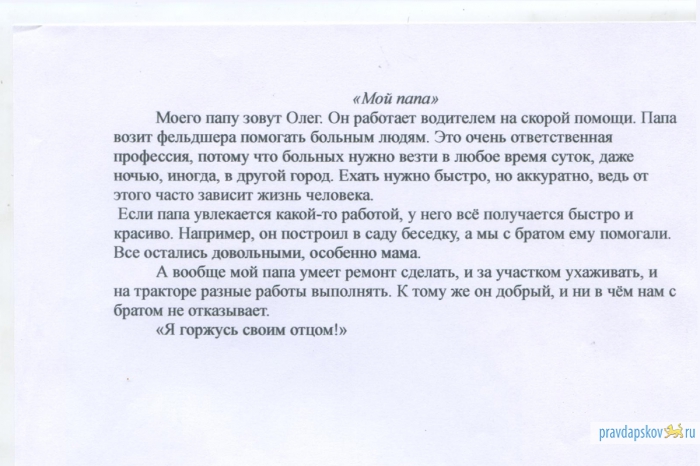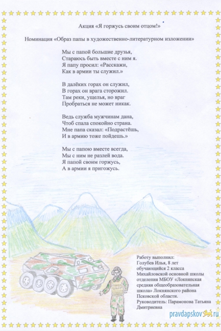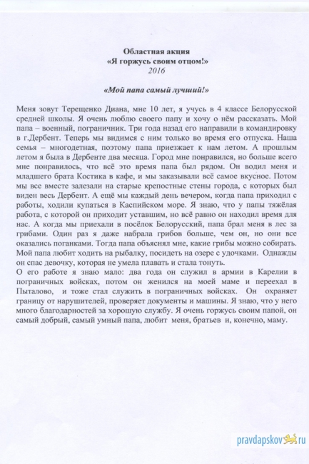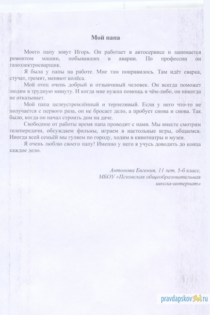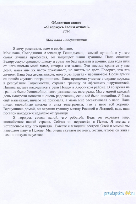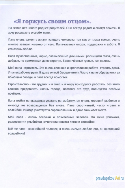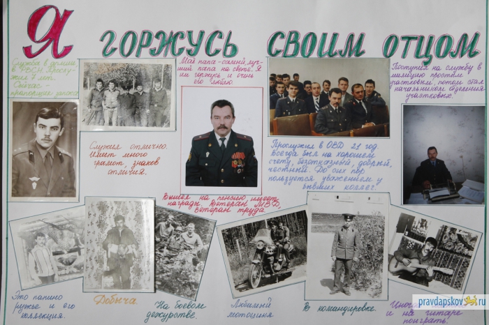 Несмотря на то, что объявленный в школах карантин передвинул все сроки проводимой акции «Я горжусь своим отцом», она не только состоялась, но и поразила организаторов своей масштабностью. Пришло более 230 работ со всех районов области. И это только те, которые прошли школьный и муниципальный отбор. Все участники акции получат сертификаты об участии. Увидеть работы можно в Городском культурном центре Пскова.