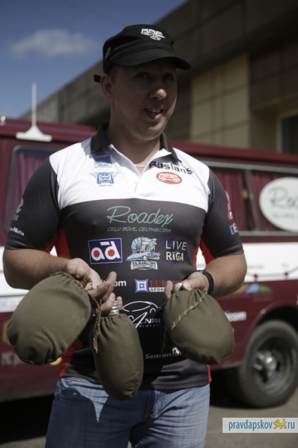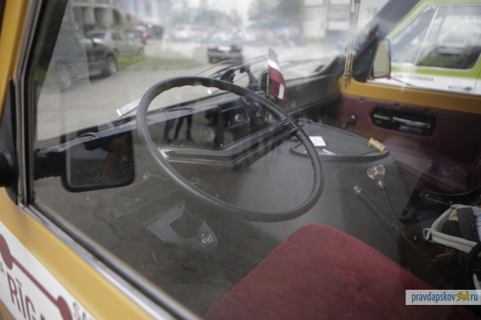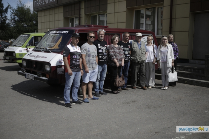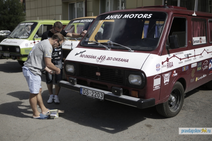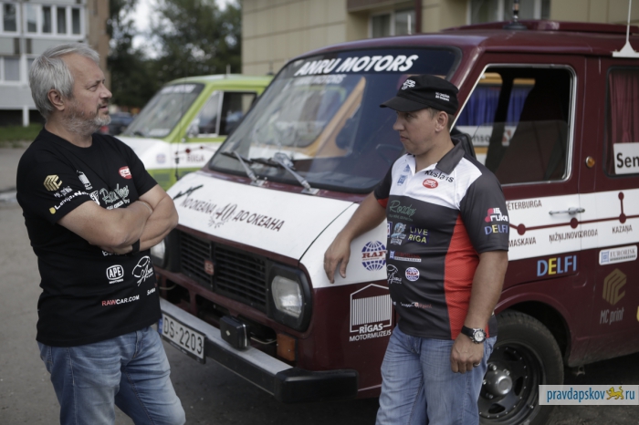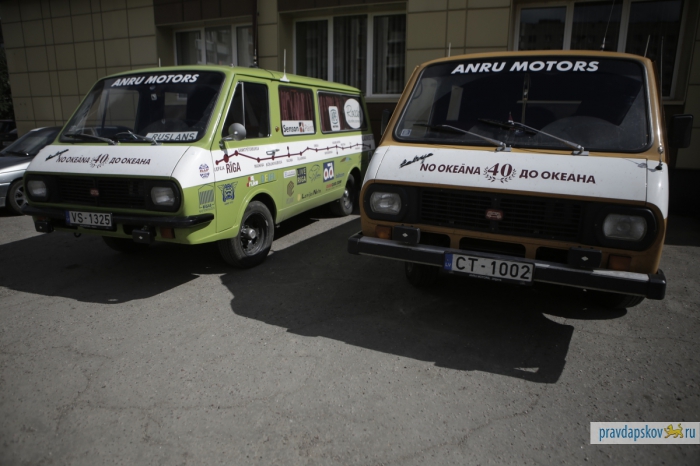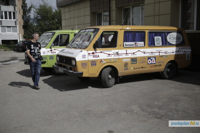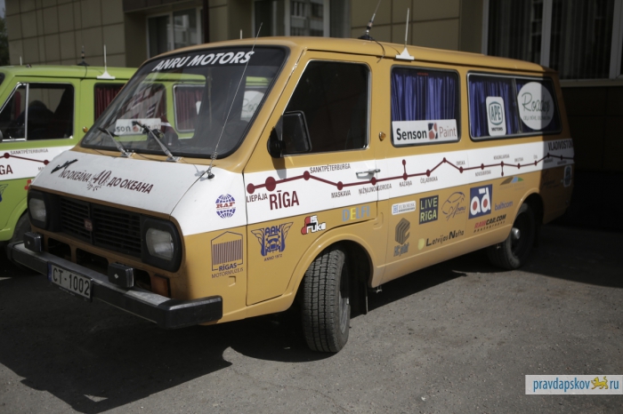 В воскресенье в Пскове возле гостиницы «Рижская» припарковались три микроавтобуса RAF с любопытными надписями на борту: Лиепая – Рига – Санкт-Петербург – Москва – Нижний Новгород – Казань – Набережные Челны – Уфа – Челябинск – Петропавловск – Омск – Новосибирск – Иркутск – Байкальск – Улан-Удэ – Чита – Хабаровск – Владивосток.