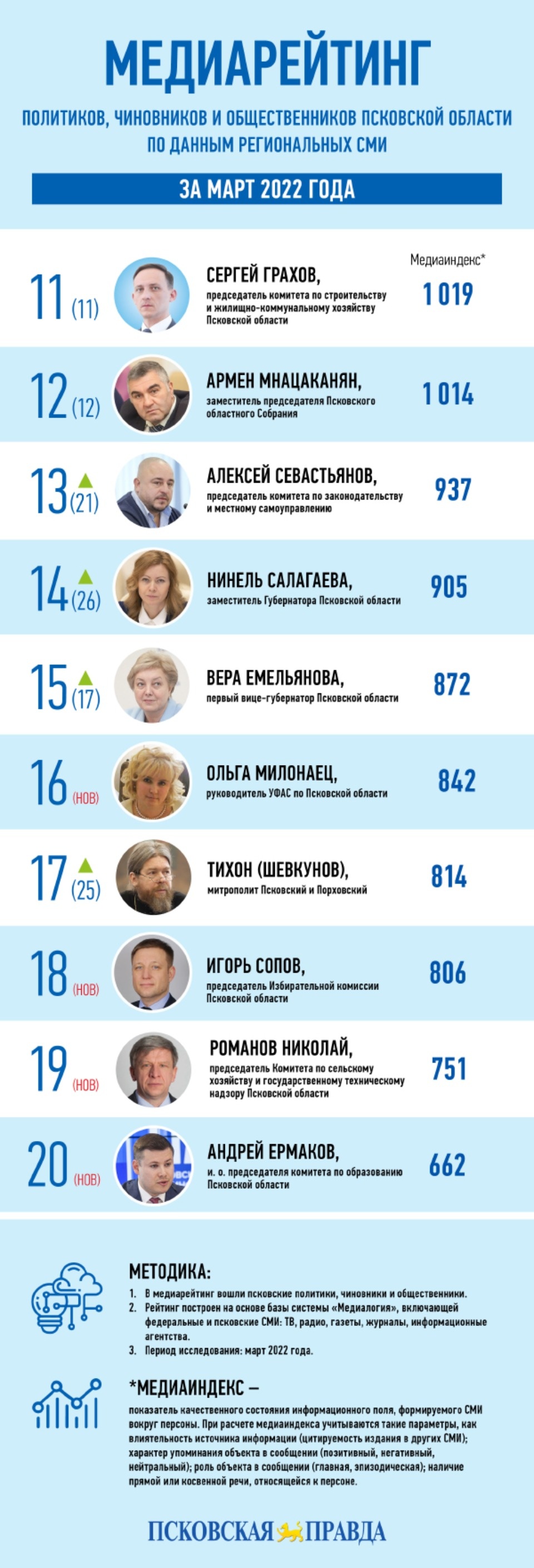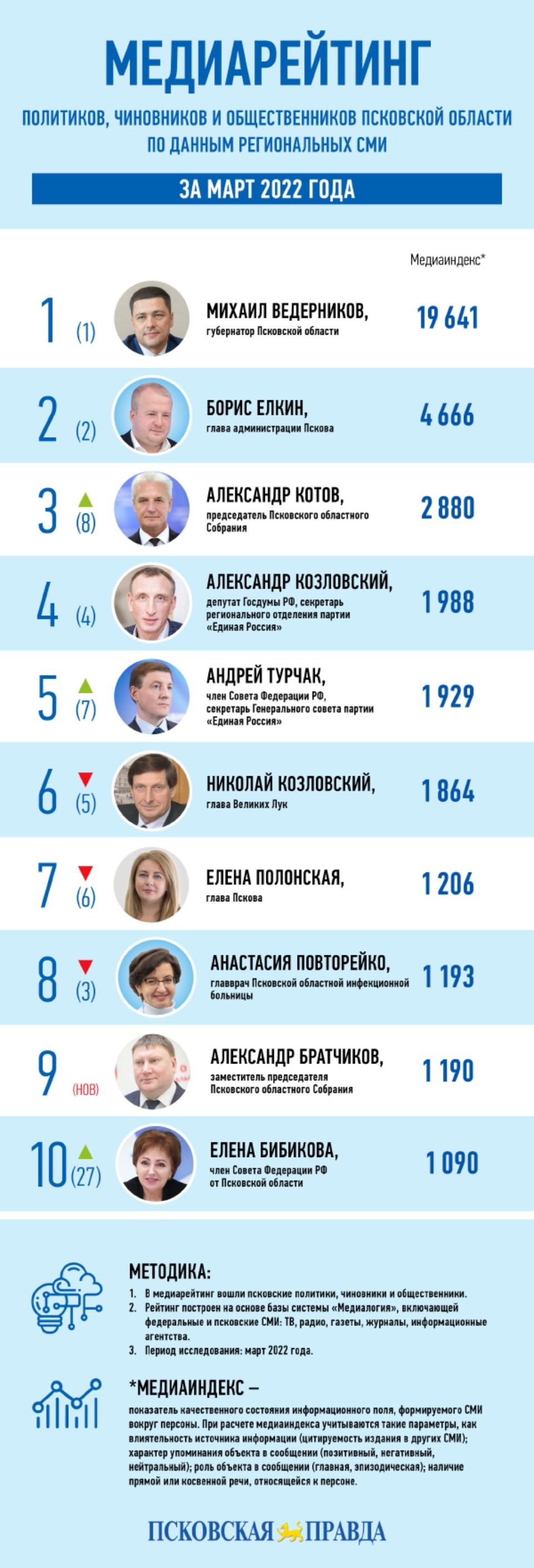 Спикер регионального парламента традиционно фигурирует не только в новостях, связанных с работой законодательной ветви власти Псковской области. В марте Александр Котов широко комментировал вопросы, связанные со спецоперацией на Украине и западными санкциями. В результате он также впервые вошел в федеральный топ-10, заняв в нем 8-е место с медиаиндексом 154.Тема последствий санкций для российской экономики также вывела во вторую десятку топ-30 Нинель Салагаеву и, отчасти, Алексея Севастьянова. Последний в марте отметил 50-летие, но в медиарейтинге поднялся в первую очередь благодаря активной работе на 8-й сессии заксобрания и «по партийной линии».