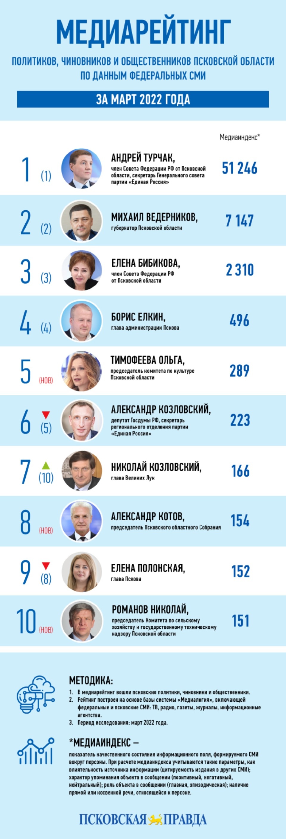 Напомним, топ-30 нашего медиарейтинга построен на основе анализа СМИ Псковской области, топ-10 - федеральных СМИ. Персоны в них ранжированы по размеру медиаиндекса: показателя качественного состояния информационного поля, рассчитанного системой «Медиалогия» с учетом влиятельности источника информации, характера упоминания и роли объекта в сообщении, а также наличия прямой или косвенной речи, относящейся к персоне.