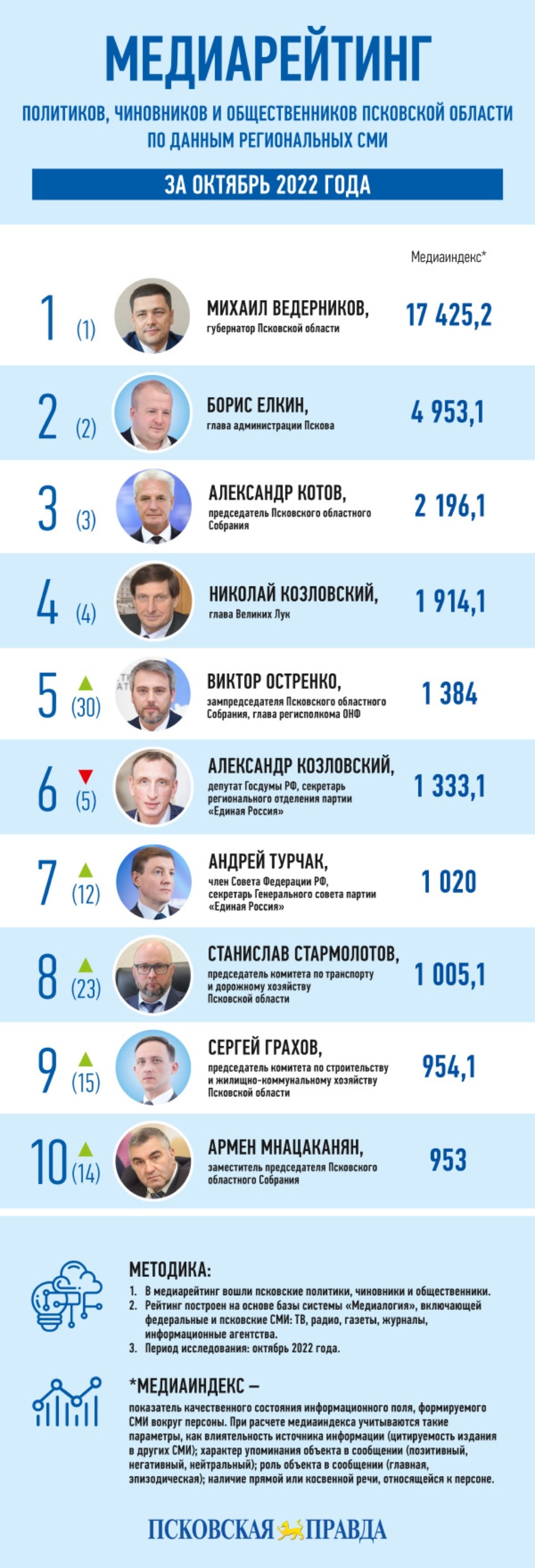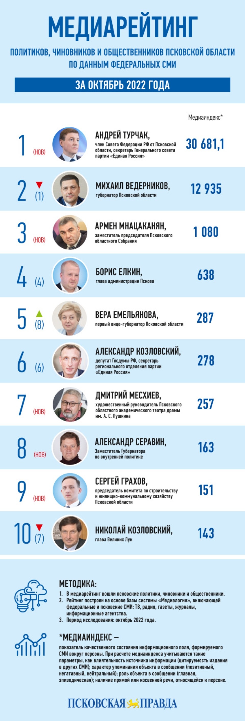Недостатка в медиаповодах у сенатора и видного единоросса не было. Это и инициативы «партии власти», связанные с мобилизацией, и работа «ЕР» на освобожденных территориях, и комментарии относительно ситуации в новых регионах России.Неожиданным стало 3-е место в федеральном топ-10 лидера фракции «ЕР» в Псковском областном Собрании Армена Мнацаканяна (медиаиндекс 1 080). Вице-спикер регионального парламента активно комментировал разрушение латвийской части «Кургана Дружбы». Дело в том, что российский сегмент мемориала находится на территории Себежского района, входящего в состав одномандатного округа единоросса.Также в числе новичков в октябрьском топ-10 федерального медиарейтинга худрук псковского драмтеатра Дмитрий Месхиев, политический вице-губернатор Александр Серавин и председатель регионального комитета по строительству и ЖКХ Сергей Грахов.