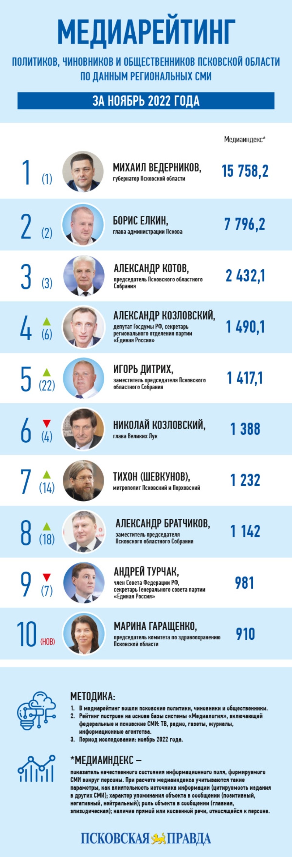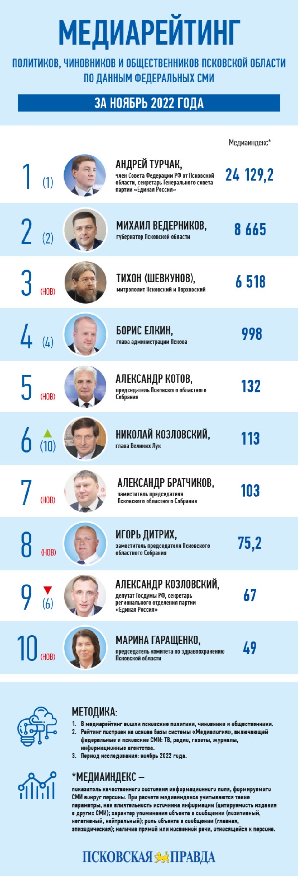 Наконец, митрополит Псковский и Порховский Тихон улучшил свои медиапозиции на 7 пунктов, но этого ему хватило, чтобы попасть в верхнюю часть регионального топ-30 (7-е место, медиаиндекс 1 232) и вернуться в федеральный топ-10 (3-е место, медиаиндекс 6 518).