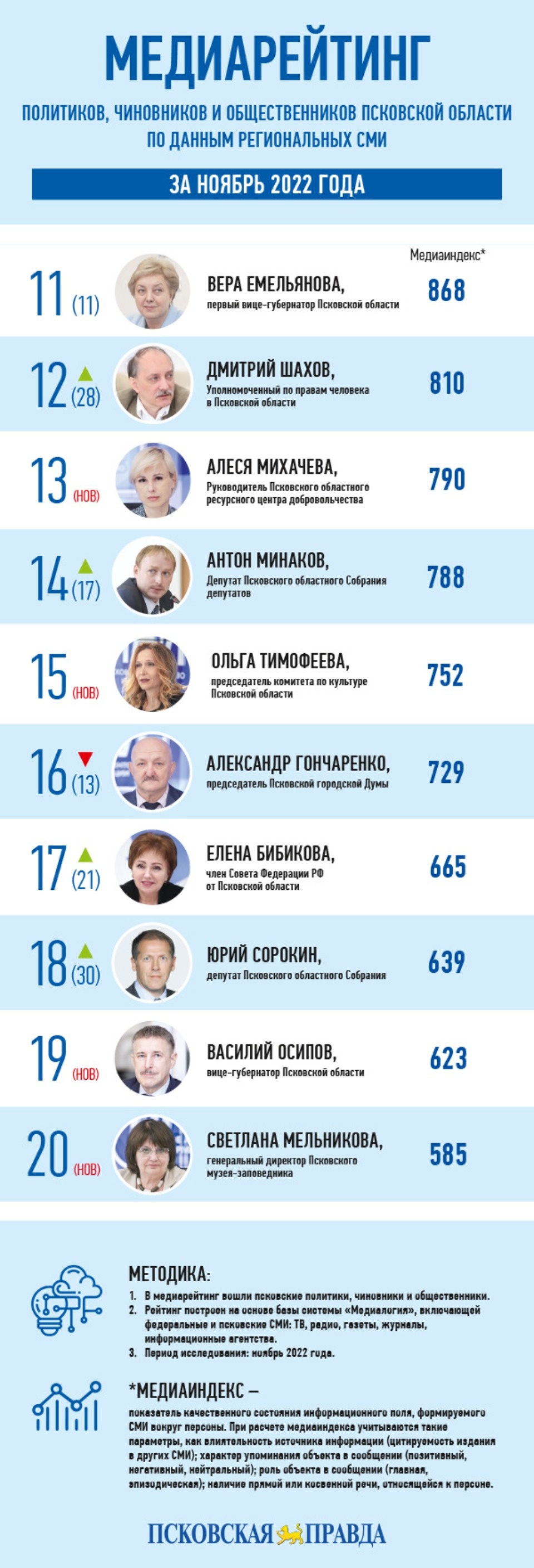 На 16 пунктов выросли позиции уполномоченного по защите прав человека в Псковской области Дмитрия Шахова (12-е место, медиаиндекс 810). В ноябре псковский омбудсмен принял участие во Всероссийском совете региональных уполномоченных по правам человека, а также обратился к руководителям области и лидерам политических партий с предложением возобновить работу областной комиссии по увековечиванию жертв политических репрессий.